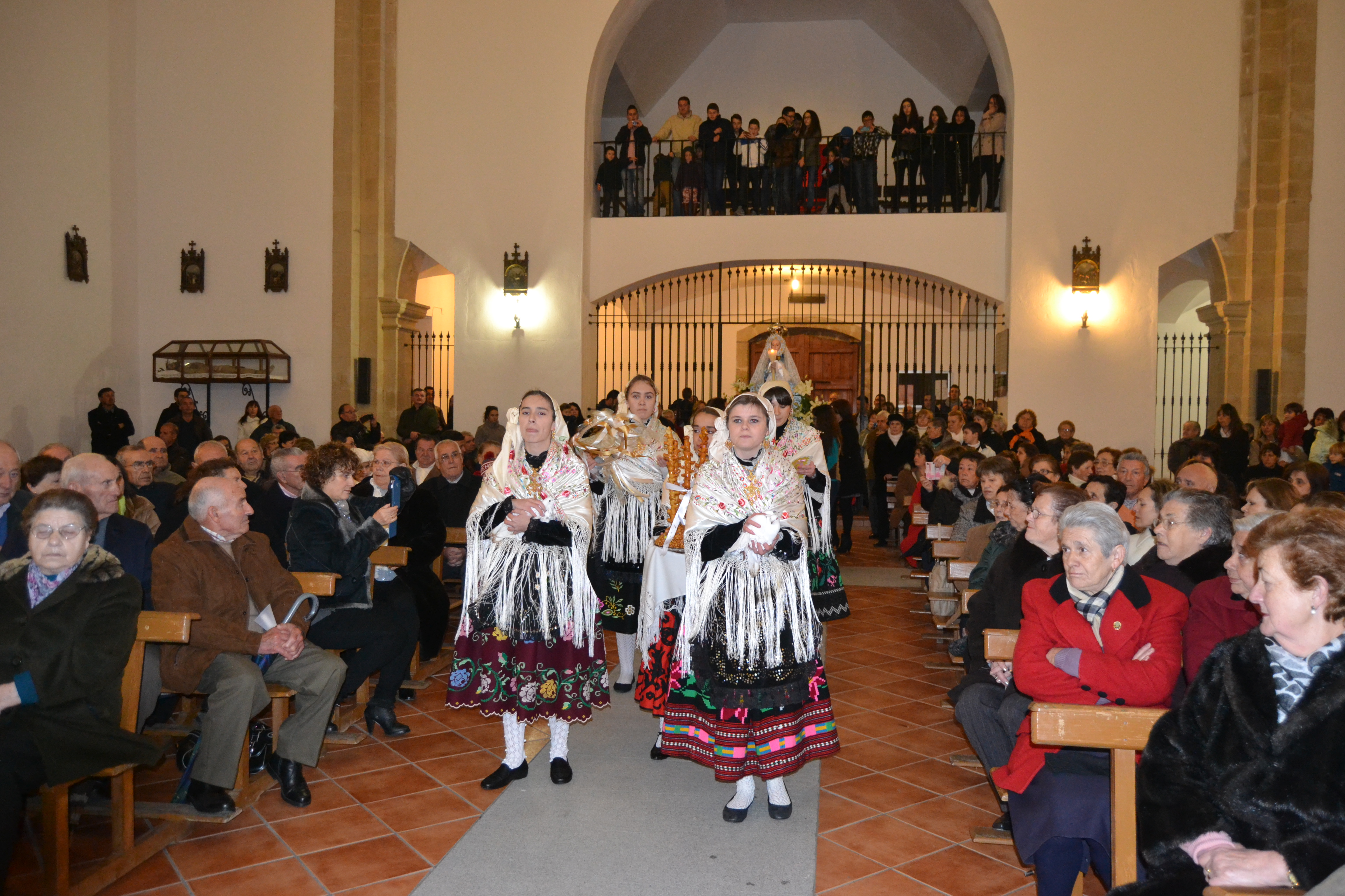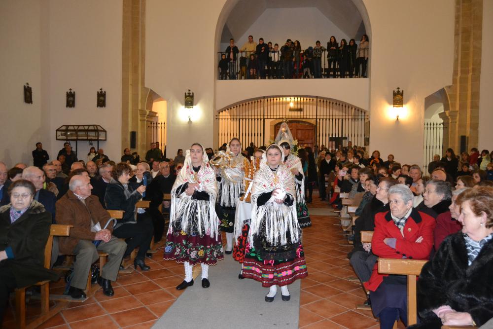 Cada joven lleva un distintivo. La primera porta una pandereta que toca acompañando el canto que ejecutan ella y sus compañeras de ofrenda. Para ello existen unas coplas rituales en honor de la Virgen. Las cuatro restantes van en parejas: la primera porta sendas palomas que sueltan en el templo al término de la copla para que revoloteen libremente por el templo. La segunda pareja porta la tradicional rosca de la Virgen, dulce típico de la región, que se rifa entre los concurrentes al final de la misa.